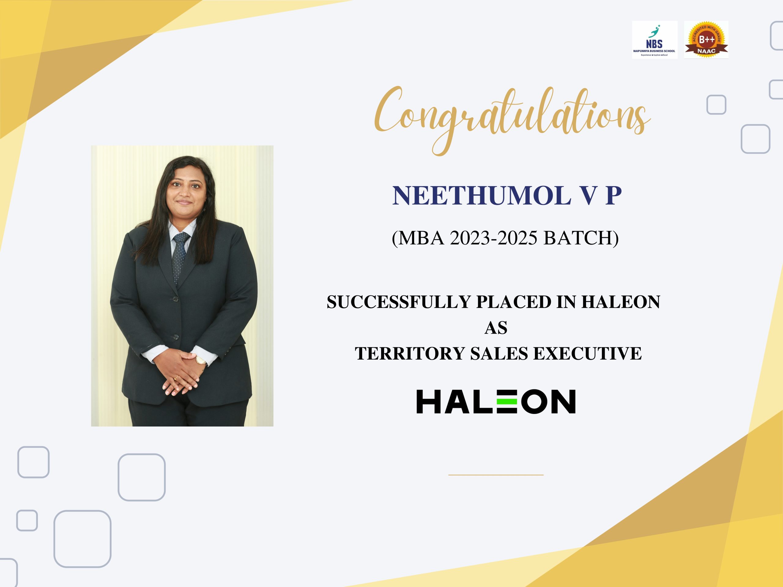 Naipunnya Business School (NBS), an offshoot of Naipunnya Institute of Management and Information Technology (NIMIT) was set up in 2012 for creating Business professionals who meet the standards of the present industry and culture.